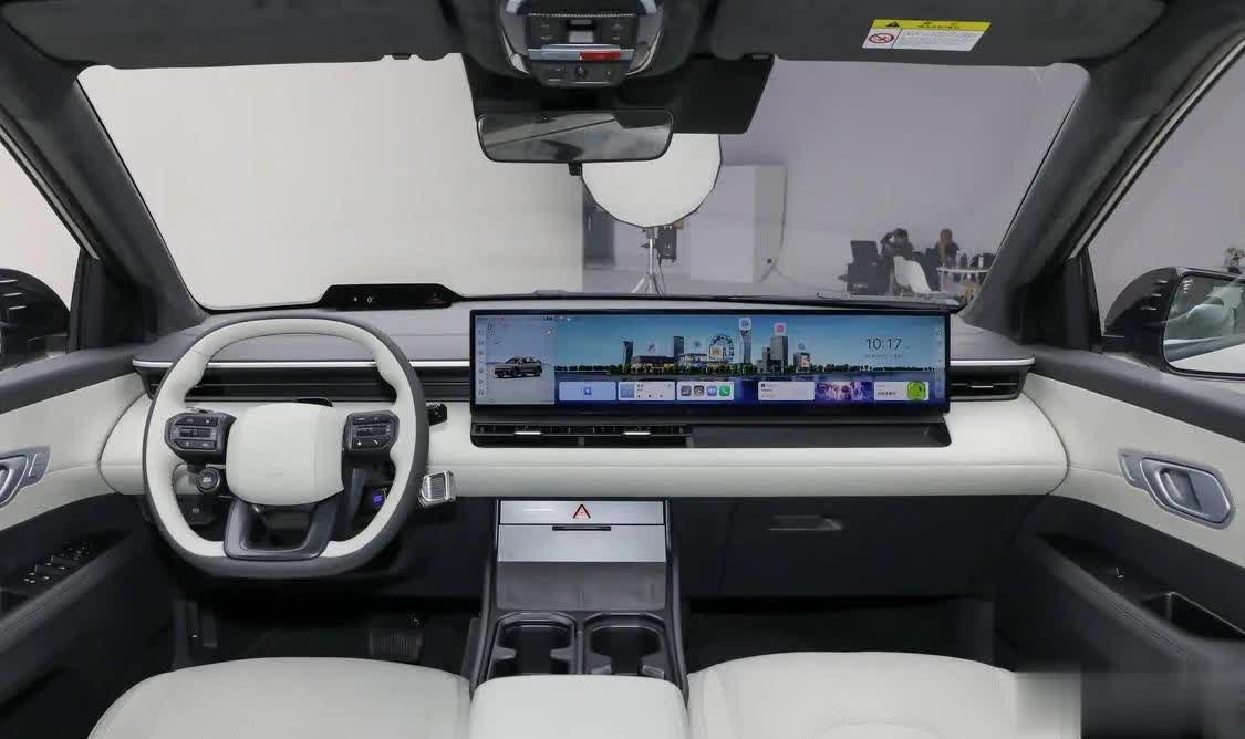 内饰上面的话,我估摸着应该是咱们中国的设计师设计的,或者是参考了咱们中国新能源汽车的一个主流设计风格。因为,在中控台上面这台27英寸的贯穿式屏幕很显眼了。不过,在主驾驶呢,EO 弈欧并没有真正意义上取消仪表盘,而是进行了简约处理,放置在了前挡玻璃的位置,有些类似于HUD。